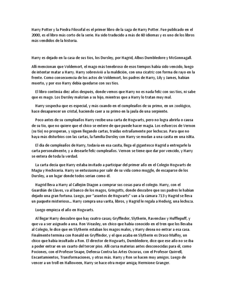Harry potter y la piedra filosofal resumen corto. Resumen de Harry Potter y la piedra filosofal. Harry Potter se ha quedado hurfano y vive en casa de sus abominables tos y del insoportable primo Dudley. Esta obra nos habla acerca de un joven llamado Harry Potter quien se entera que es un mago y su vida cambia de manera drstica cuando decide desarrollar su don en una escuela de magia Hogwarts.