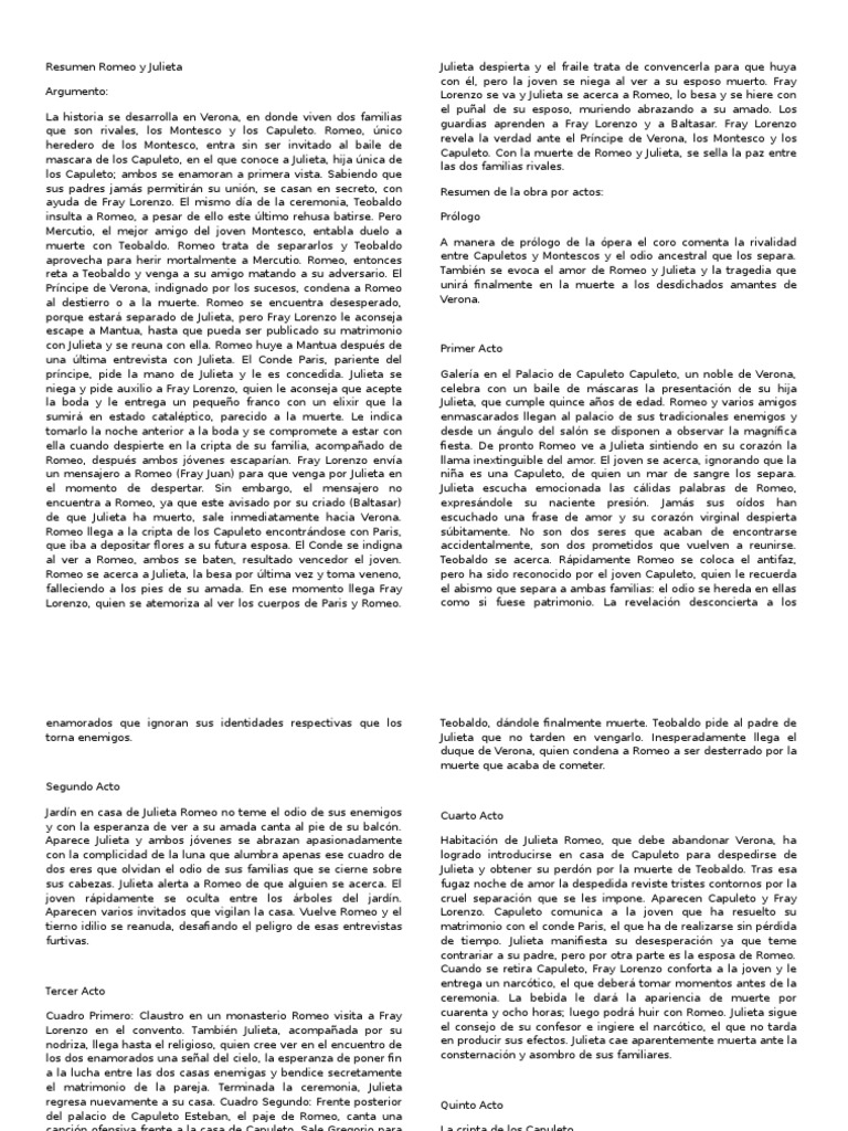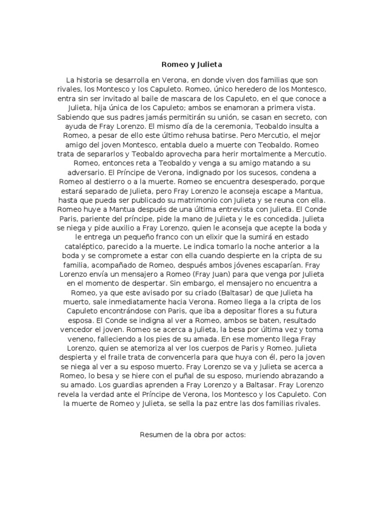 Dramtico y tragedia Tema. ROMEO Y Julieta - Resumen de la obra de actos y escenasact IEscena IEn square Verona Benvolio primo de Romeo y Tybalt primo de Julieta cara a cara en una batalla de espadas despus de tratar de separar a sus siervos de lucha. Resumen corto de romeo y julieta para nios de primaria De Resmenes de LibrosResumen Romeo y Julieta de William Shakespeare Gnero y especie.