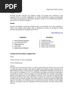 Cuando sal de la Habana vlgame Dios Enviar esto por correo electrnico BlogThis. El protagonista principal de este cuento es Langerhaus en el Principio del Placer resumen es un nio prodigio por el hecho de que toca el clavecn de una manera sobresaliente Gerardo era su nico amigo desde la edad de los doce aos estn todo el tiempo junto compartiendo y Gerardo siempre defiende a Langerhaus de las burlas que le hacen sus compaeros. Era 1972 140 pgs A Salvador Barros.