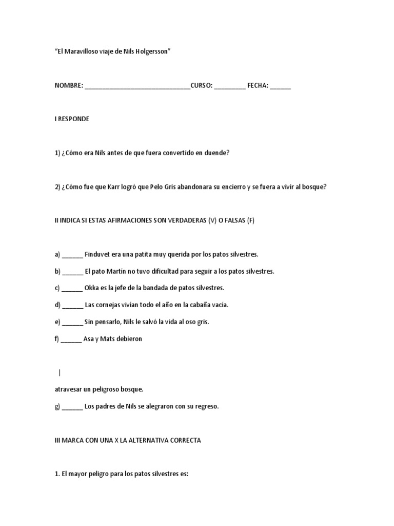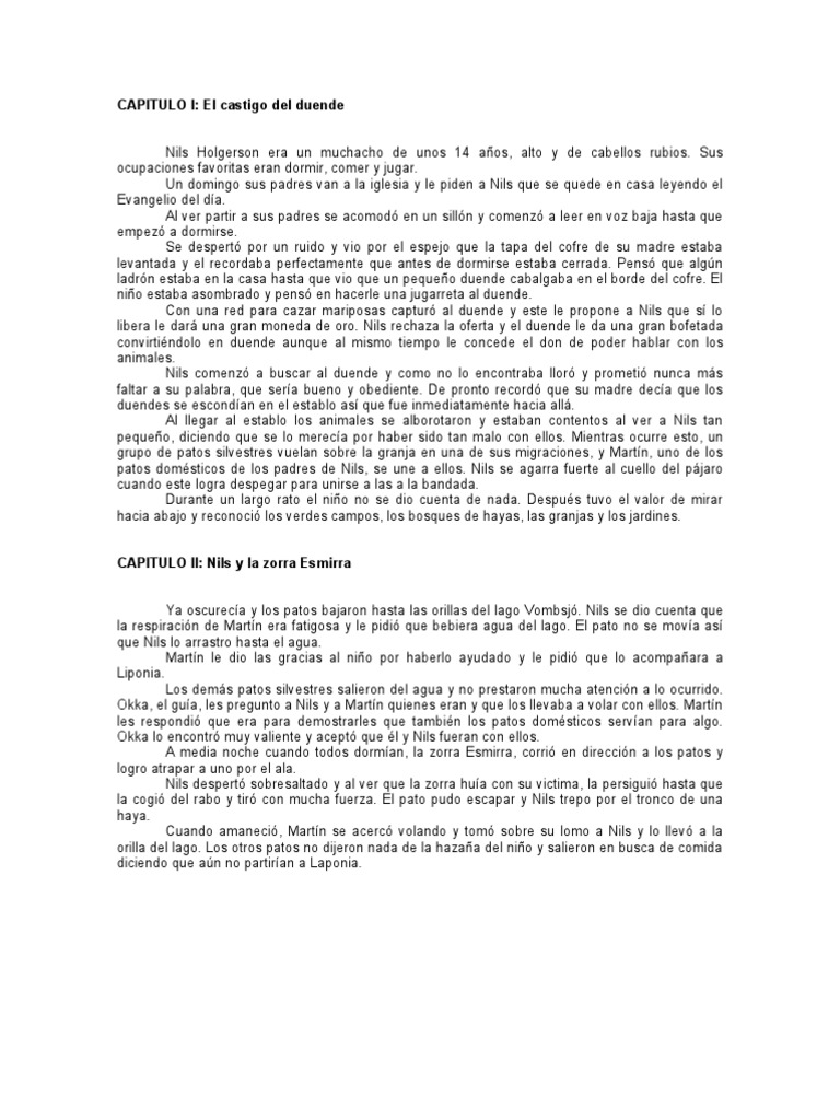 Al ver partir a sus padres se acomod en un silln y comenz a leer en voz baja. Qu sucesos de esta obra pueden ser realidad y cules fantasa. Resumen y sinpsis de El maravilloso viaje de Nils Holgersson a travs de Suecia de Selma Lagerlof Una bandada de patos salvajes realizando su migracin anual da la vuelta a Suecia llevando consigo al pequeo Nils Holgersson como un nuevo Pulgarcito aventurero.