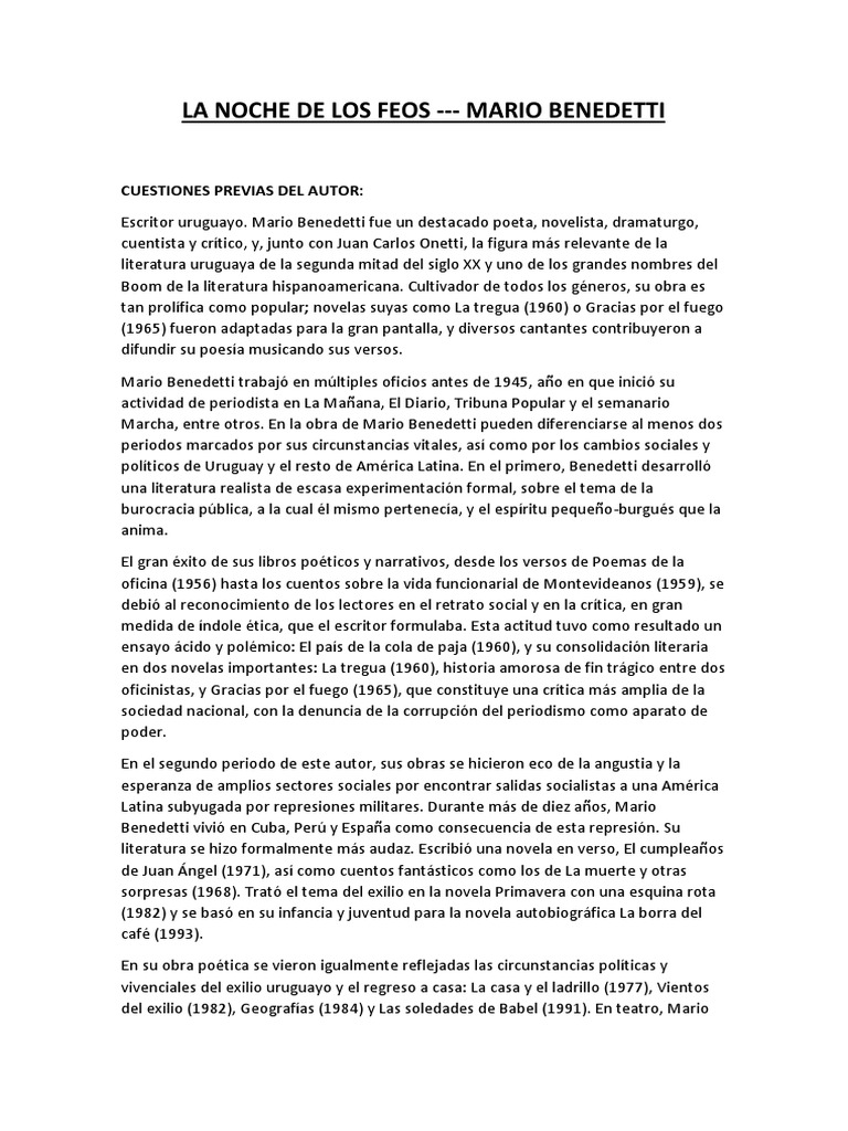 La Noche De Los Feos Analisis Docx La Noche De Los Feos Mario Benedetti Mario Benedetti Naci U00f3 En Paso De Los Toros Tacuaremb U00f3 Uruguay El 14 De Course Hero