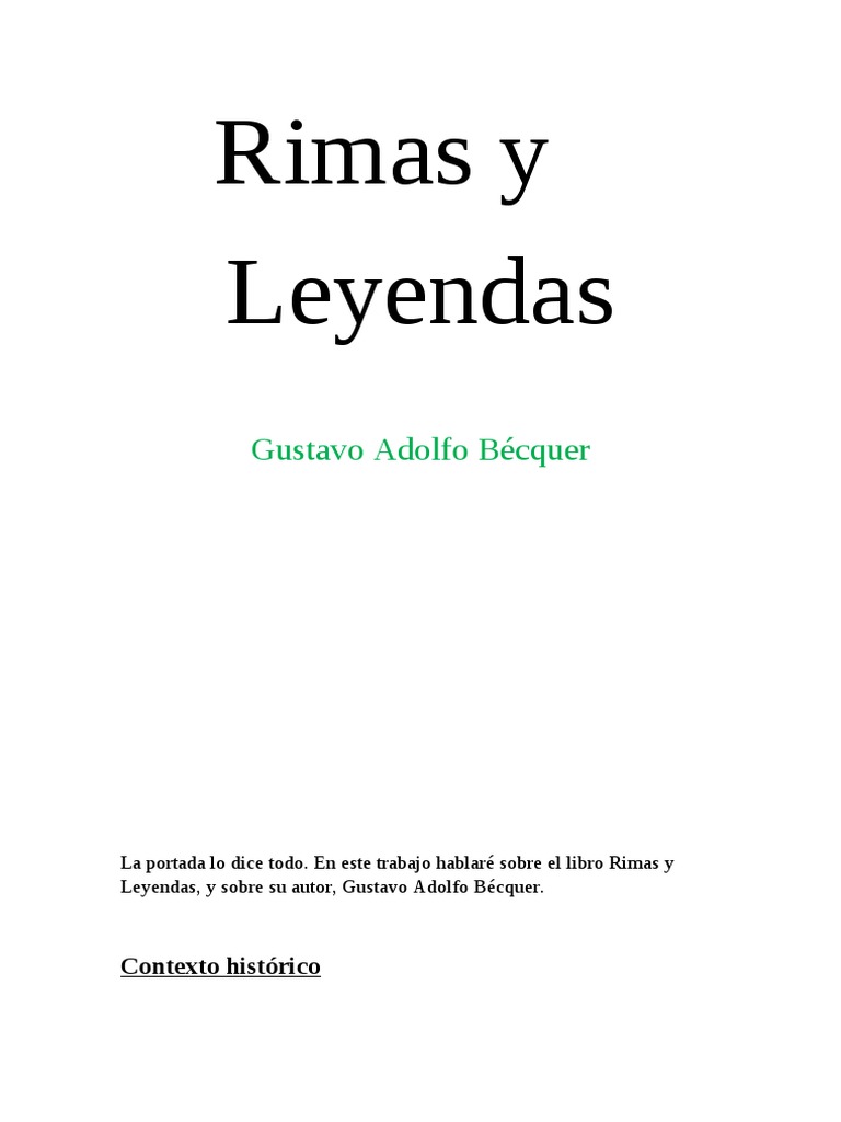 Rimas y Leyendas Autor. Vivi ms tarde con su madrina donde empez a leer a los autores realistas y romnticos. Rimas y leyendas resumen corto Margaret es llevada a ver al squito que va a la guerra del Conde de Gomara y se desmaya al ver que Pedro su amante es el conde mismo.